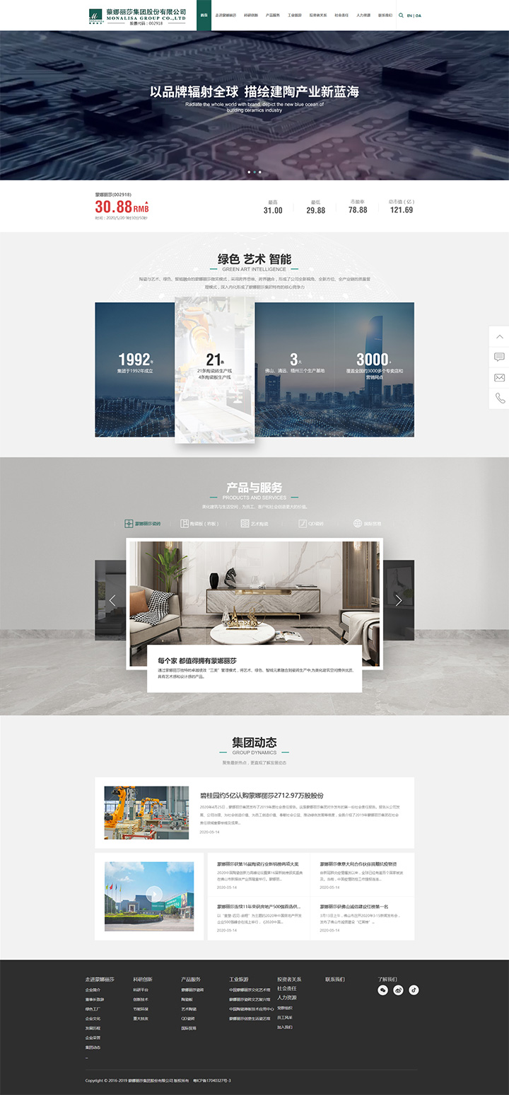 近日蒙娜丽莎集团股份有限公司的集团官网的首页进行了全新的形象升级,主色调未改变,主要在内容布局上做了新的调整。BANNER区域增加了视频播放,通过动态效果来传递公司的企业文化形象。BANNER下方放置了四大区域:股票的实时动态数据、核心竞争力、产品与服务和集团动态。从四个方面全方位的展现了集团的实力、形象、产品和信息动态,为浏览者更好的了解蒙娜丽莎集团。