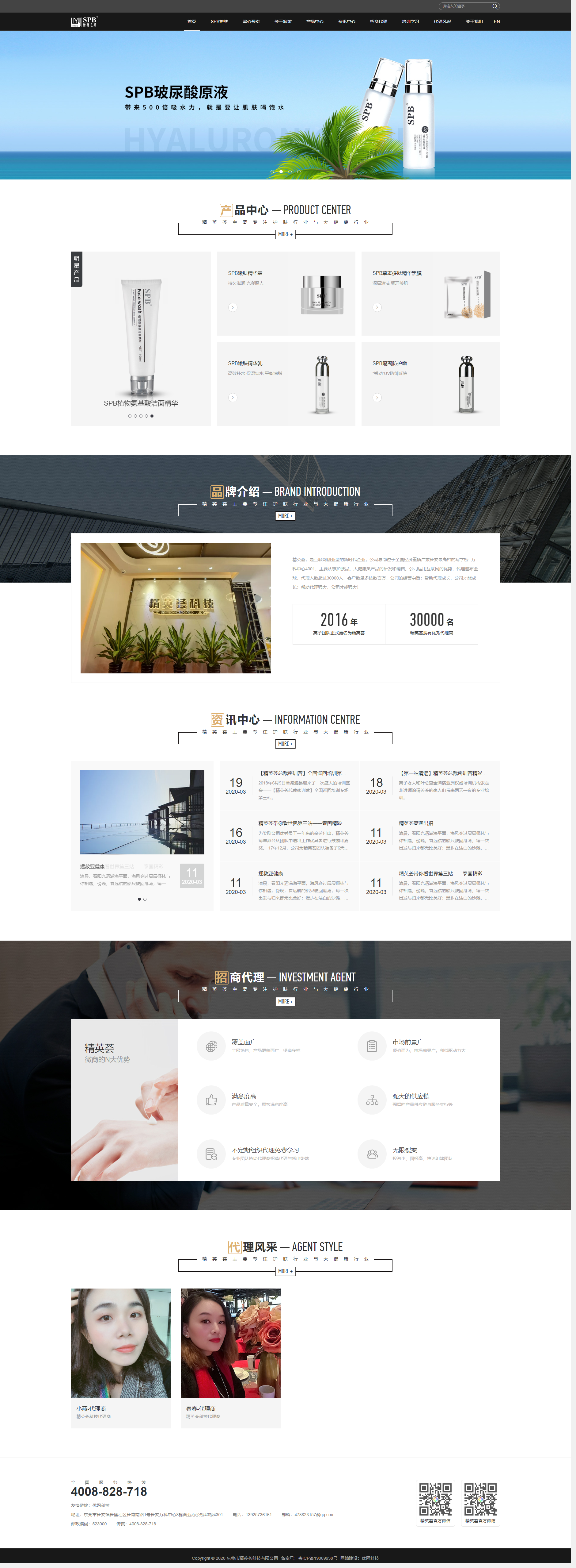 首页分为5个区域,BANNER下方为:产品中心、品牌介绍、资讯中心、招商代理和代理风采。全面的向浏览者展现公司实力、主推产品、品牌文化和相关的资讯,让浏览者能更直观的了解精英荟科技,加深企业的品牌形象。页面交互效果在首页呈现简洁、大气,为浏览者浏览时有更流畅的体验,视觉上不容易疲劳。