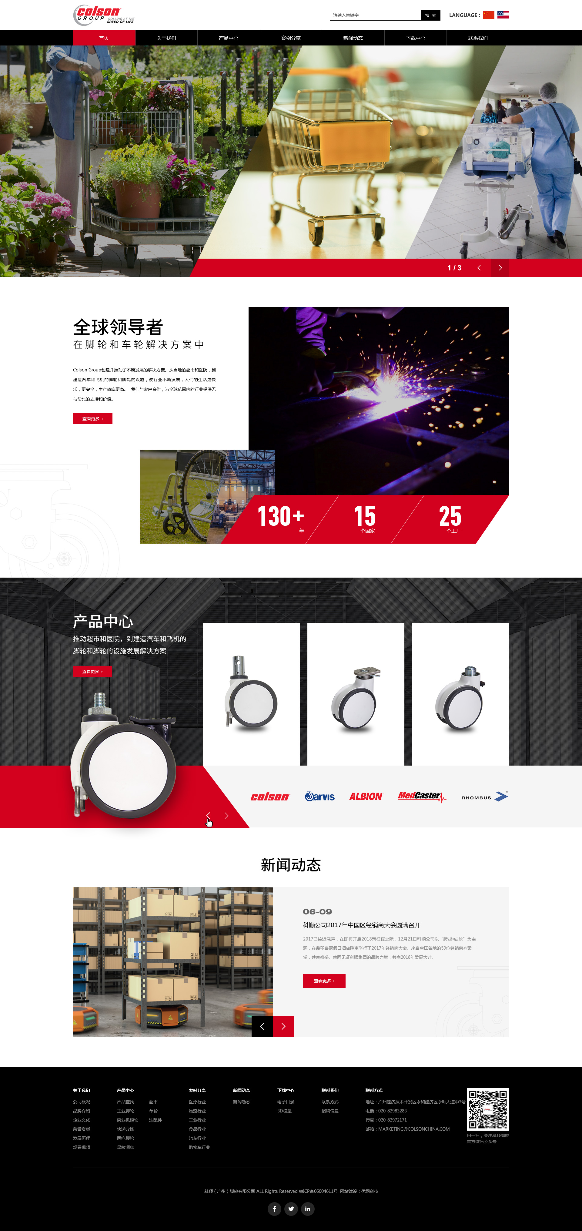 首页分为三个区域,BANNER下方为:实力优势、产品中心和新闻动态。全面的向浏览者展现公司实力、主推产品和相关的资讯,让浏览者能更直观的了解科顺(广州)脚轮,加深企业的品牌形象。