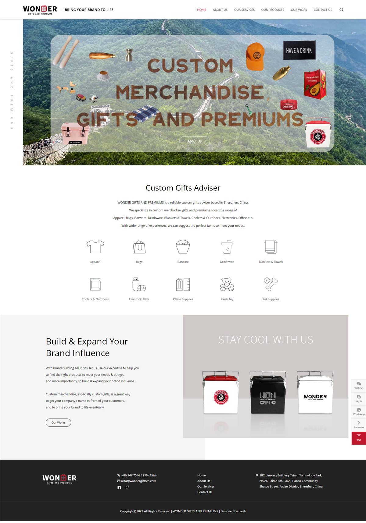 WONDER GIFTS AND PREMIUM是一家可靠的定制礼品顾问公司,总部位于中国深圳。我们专业生产企业礼品、商务礼品、促销礼品、赠品礼品等,涵盖范围广泛服装、箱包、酒吧用品、饮料、毛毯和毛巾、冷柜和户外用品、烧烤用品、电子产品、文具、宠物用品等。凭借在几乎所有行业的丰富经验,我们可以推荐完美的产品以满足您的需求。