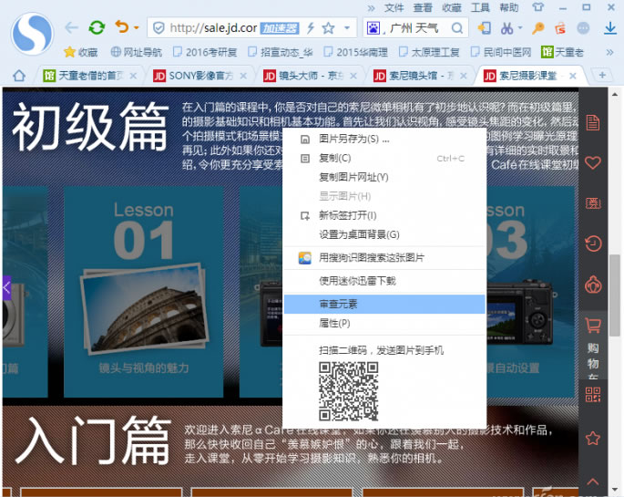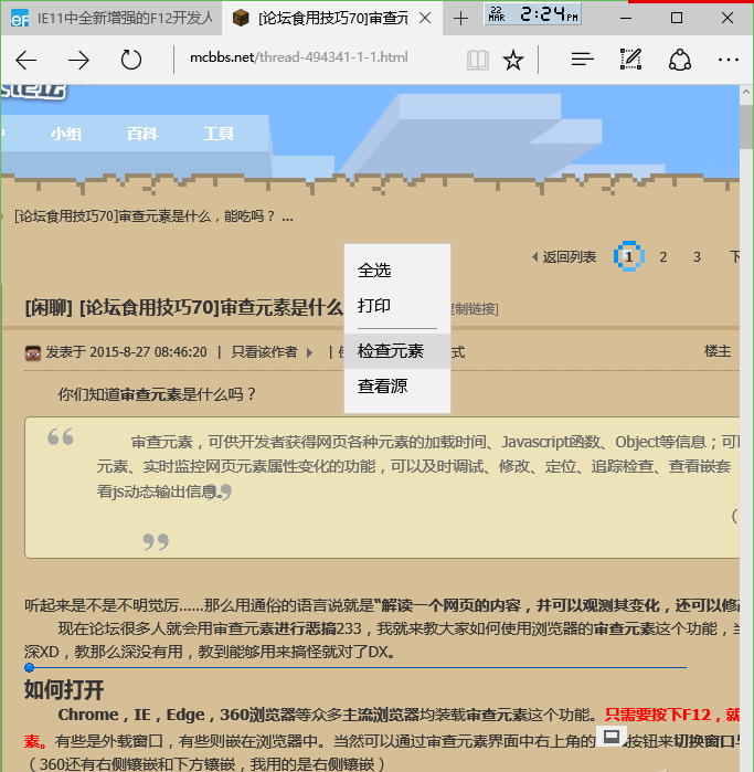 在Windows 10自带的Edge浏览器页面内单击鼠标右键,在弹出的快捷菜单中,你会发现一个“检查元素”的项目(图1)。这在以前的传统浏览器中是未曾见到的。那么,其他浏览器中是否存在这个选项,它是干什么用的?我们在新版的搜狗浏览器内的右键菜单中,也发现有一个“审查元素”的项目(图2)。大家知道,搜狗浏览器目前采用的是Chromium+Trident内核,其中也有基于谷歌Chromium的内核。而新版的360安全浏览器,也采用谷歌的Chromium内核,同样有这个“审查元素”的选项。而作为正宗的Chromium内核的浏览器,谷歌Chrome网络浏览器中的“检查元素”功能更是原生的,只不过它的名称是“检查”(快捷键为Ctrl+Shift+I)(图3)。