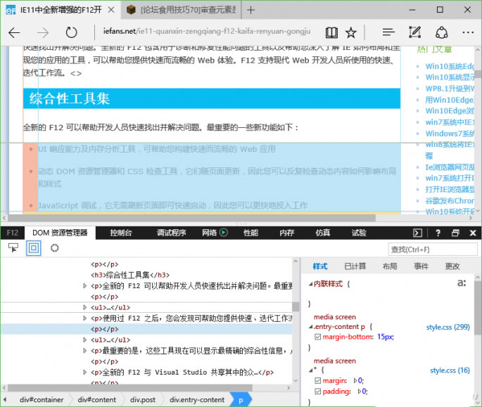 在Edge浏览器中,如果需要进入程序的调试状态,除了从右键菜单命令中选择“检查元素”外,你还可以直接在浏览器页面内随时按下F12功能键来完成这项工作。以往,我们常常在电脑基础培训班中听老师说,F12功能键没有什么用途,现在它终于派上了合适的用场。