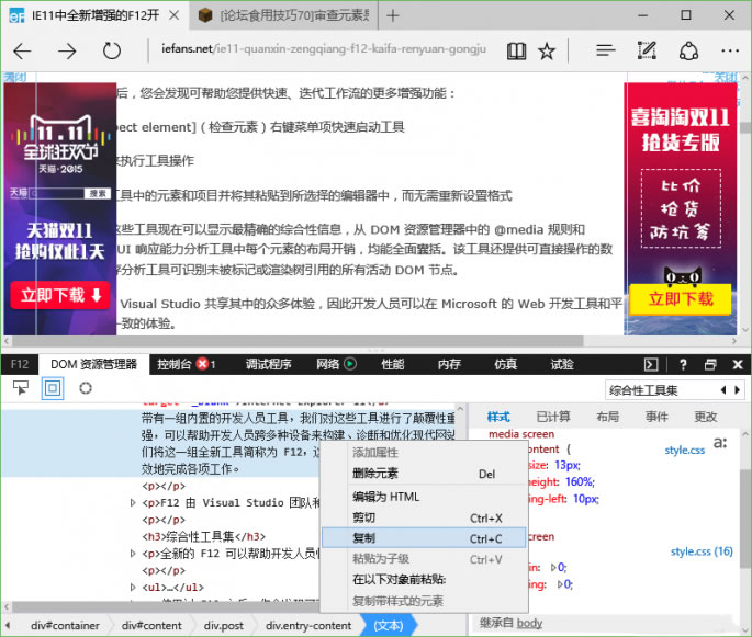 利用内容。有时我们发现网页中的某些内容不允许被选中,想要复制却无法完成。这时,我们可以借用“审查元素”窗口,找到网页中要复制内容所对应的内容段落,右键单击之后选择“复制”即可将网页中受限的文本或其他内容,以无需重新设置格式的方式复制下来,供其他编辑器利用(图6)。