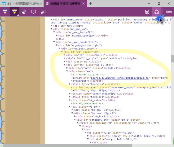 解读网页。打开“审查元素”代码窗口之后,点击工具栏中部的DOM元素突出显示按钮,将鼠标移动到窗格的不同代码段之后,发现网页的对应部分会被高亮选中。这说明你当前选择的代码正好对应于网页中被标亮的部分。反过来,如果要查明网页中某个部分是如何设计的,那么,只需查看代码窗口中光标所在段落的对应代码,仔细研究,就可以很快学到此部分网页效果的实现方法了(图4)。