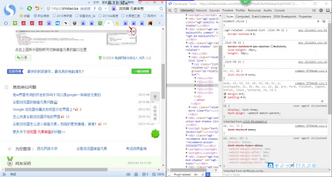 如果觉得审查元素窗口占据了浏览器主页面,给对比调试带来了不便,那么,还可以执行分屏放置,将网页和审查代码窗口分立与屏幕的左右两侧。具体实现方法是,点击审查窗口标题栏右上角的“Undock into separate window”按钮,先使得网页窗口和代码窗口分离,然后拖动两个窗口的标题栏,分别“丢”向屏幕的两侧,这样就可以获得更多的空间进行对比测试了(图5)。