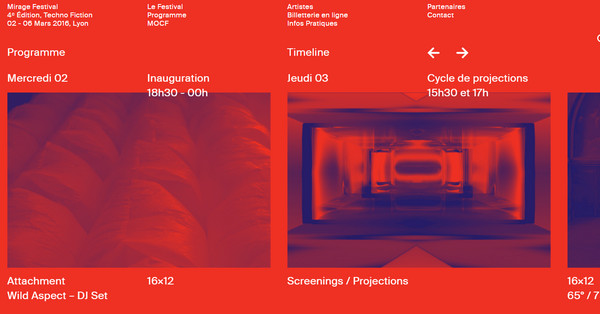 Mirage Festival 的红蓝搭配看起来略显怪异,但是两种略显疏离的色彩反而营造出独特的美感,尤其是同主流的白底黑字进行对比的时候。