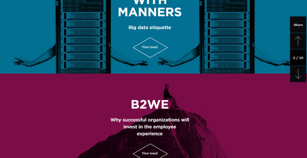 Fjord Trend 的首页中,不同图片的背景图被设计成了双色配色。设计师所选取的色彩秉承了传统意义上双色调图片的配色风格,色彩沉稳现代,柔和而不具侵略性,但是作为主要的色调,两者又有着明显的对比。