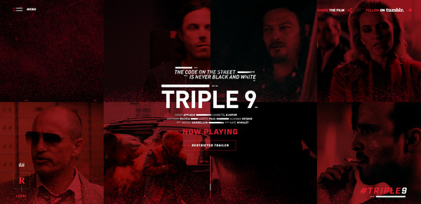 经典的红黑色被Triple 9的首页用作双色配色的主色调,两种情绪浓烈的色彩让这里的视频和图片都带有微妙的情绪。与此同时,色调的选取还让网站隐隐散发出暴力和野蛮的感觉,个性十足。