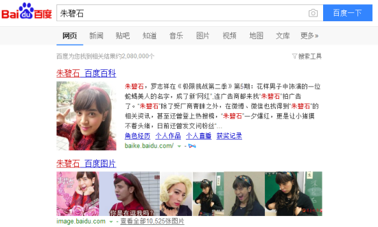 这类类似网红性质的传播,各大媒体都大量的进行报道传播,形成各种新闻头条,比如罗志祥在《极限挑战第二季》第5期曾男扮女装,扮演一名叫朱碧石蛇蝎美人。如果你搜索朱碧石的话,如下图:一目了然。