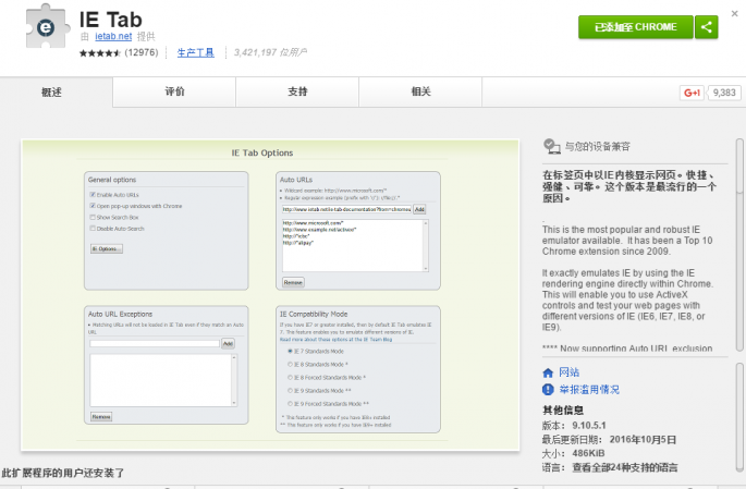 首先在浏览器的插件应用商店搜索IE Tab,如果不能,可以从http://www.downloadcrew.com/article/3972-ie_tab_for_chrome处下载,新版本是9.10.5.1。