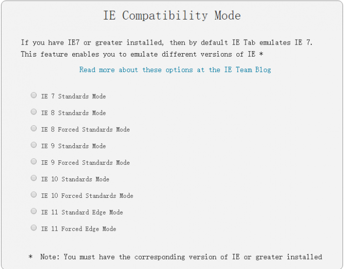 你以为IE Tab就这么点能耐?还不止,大家都知道,有一部分政府机关类的网站出于安全/系统兼容性的考虑,要求的IE版本远非我们现在使用的,新系统又不能安装老版本的IE,这种情况IE Tab也可以发挥作用。它可以实现向下模拟兼容的功能,对着任何一个Chrome界面点击鼠标右键,在弹出菜单里选择IE Tab选项-选项。
