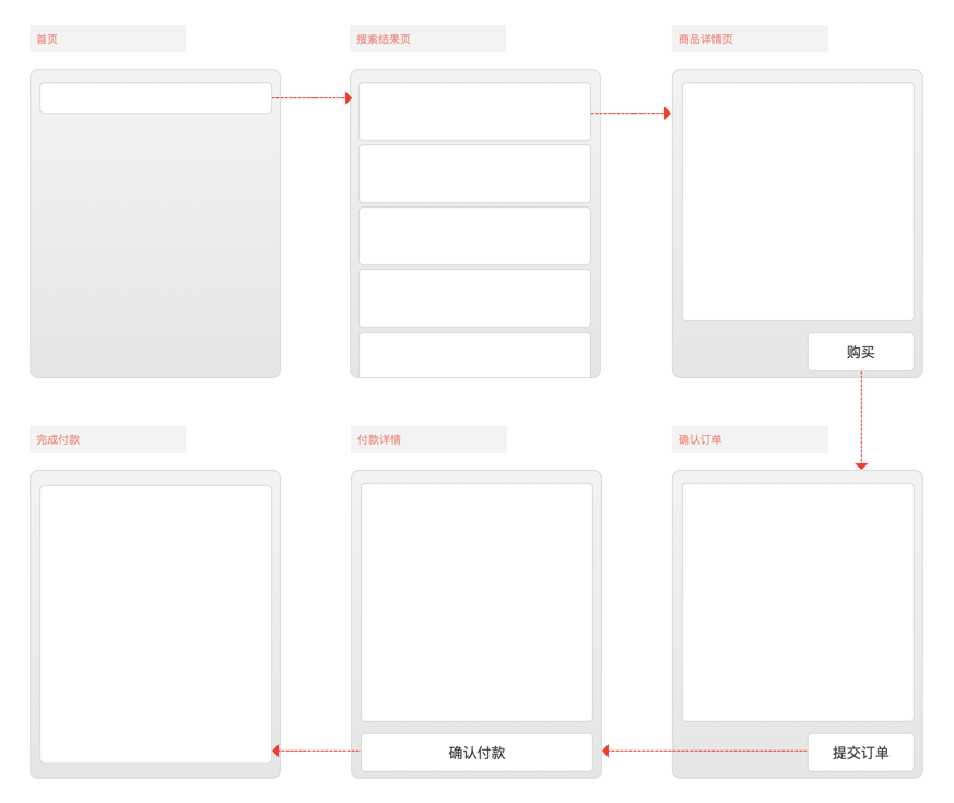 而页面流程图的对象是页面,页面是互联网产品设计基本的单元,不管APP也好、H5也好、PC端也好,这些产品由一个个页面组成。页面流描述了用户完成一个任务需要经过哪些页面。也就是我在哪,经过什么操作,能去哪。页面流有三个要素:页面、行动点、连接线。下面拿购物的页面流举例说明: