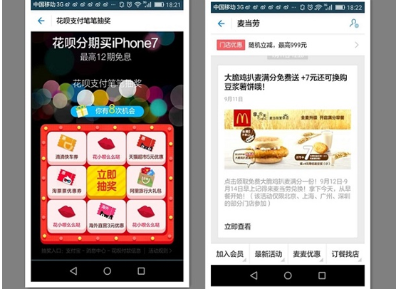 如简单的抽奖活动,蚂蚁花呗抽奖活动,虽然样式简单,但对于经常使用蚂蚁花呗的用户来说还是非常有吸引力的。还有麦当劳经常做的一个活动——加小钱换购。