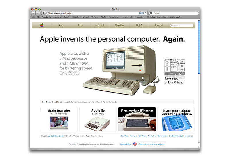 网页设计也有所谓的支撑其视觉效果的骨架,这个骨架在早期的网页设计的视觉上是非常明显的。1983年苹果官网的首页设计,可以清晰的看到这种矩形块状的整形切割。