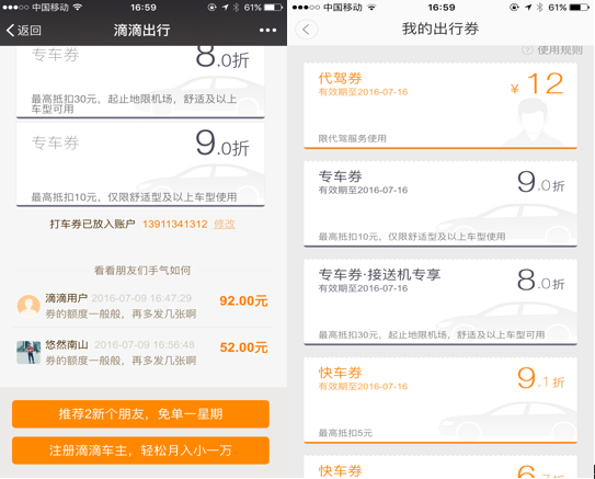首先看滴滴打车的案例,前不久我打开朋友分享的滴滴红包中,提示:获得52元的滴滴红包,于是我很开心,想要去一探究竟,看看这52元一共是发了几个红包。等打开滴滴APP一看,原来这52元的算法是按照打车折扣高可省金额算出来的,也就是说要想完全获得这52元,用户得花满足打折条件那么多的费用,这个体验就不太好了。作为用户感觉受欺骗,受伤害,你可以不给我红包,可你为啥要骗我给了我红包。你可以不爱我,可为啥要骗我投入了感情……