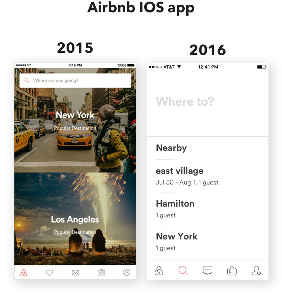 Airbnb的UI改版产生的媒体影响力,并没有一个月后Instagram的改版那么大(可能因为它没有一个光彩夺目的新图标),但它也使用了许多相同的化繁为简技巧。