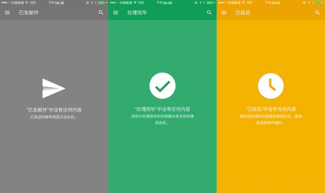 Inbox给不同文件夹的清空状态设计了不同的颜色,同时简单明了的说明了每个文件夹对应什么功能,什么文件将会显示在这里。