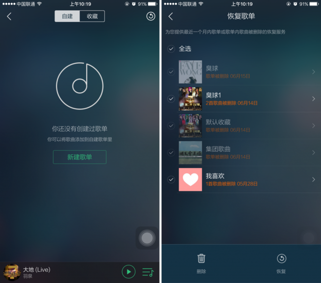 QQ音乐支持恢复一个月内删除的歌单和音乐,很用心地解决了这个小概率事件。越是概率小,对用户产生的结果也越可能严重,试想当你一个手抖不小心把经营多时的歌单给删了,看到此功能必会有种大难不死必有后福的快感。