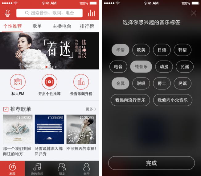 云音乐的发现tab下首个模块就是以音乐口味著称的“个性推荐”,在这里我们会根据用户的听歌数据计算出对应的口味,从而实现千人千面的个性化内容。