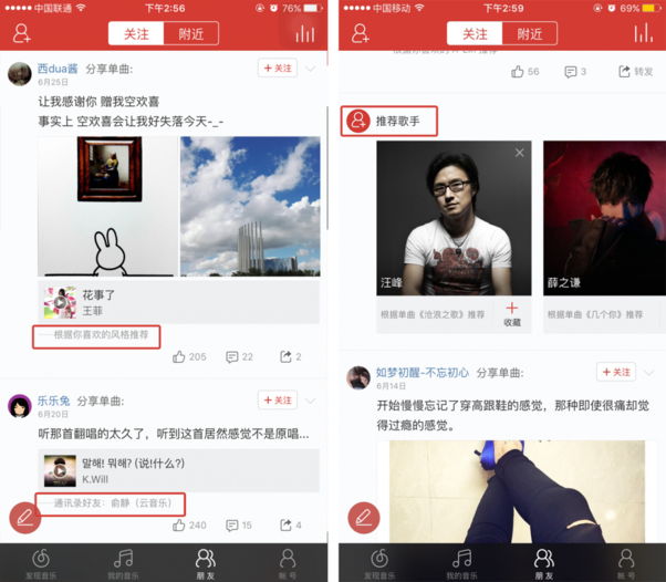 无内容或内容较少时,系统会根据用户的听歌口味、绑定的微博/手机通讯录好友、热门内容进行推荐。既可以通过感兴趣的人发现感兴趣的内容,也可以通过感兴趣的内容进而找到志同道合的朋友。
