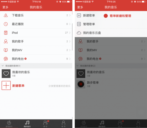 当用户通过引导尝试性的创建了一个属于自己的歌单,入口便会消失且自动出现“更多”下拉浮层,引导用户在这里新建/管理歌单。
