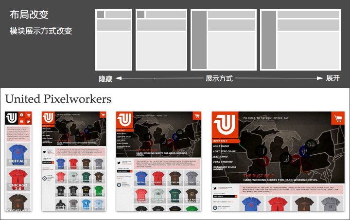 .可切换的固定布局:同样以像素作为页面单位,参考主流设备尺寸,设计几套不同宽度的布局。通过设别的屏幕尺寸或浏览器宽度,选择合适的那套宽度布局;