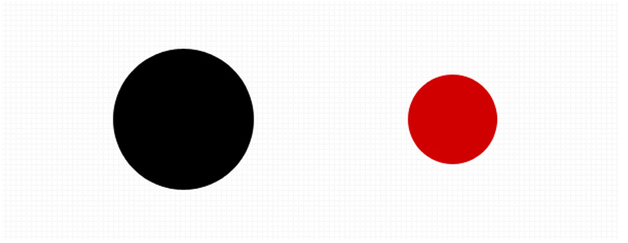 再来看看下图中,颜色和大小是怎样影响我们的界面视觉的。例如,很多人在眼扫视而过时,不会仅仅就看到了两个圆。事实上,他们在看这两个圆时,已经获得了这样的信号“一个黑色的大圆和一个红色的小圆”。也就是说,对比关系已经可以在时间就进入人们的大脑中,形成强烈的印象。