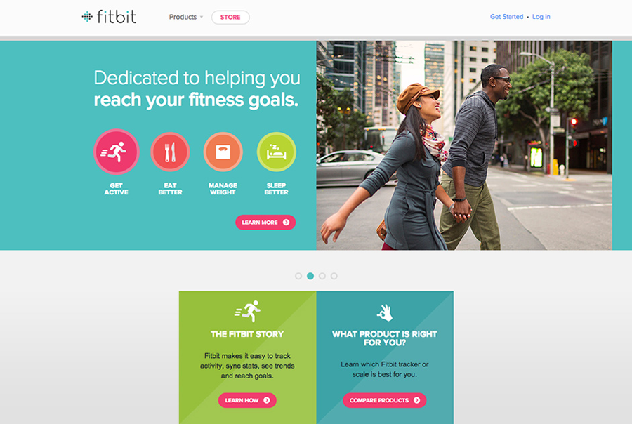 上面这个网站采用的是视觉体系中的Z模式,在此模式下,他们运用色彩的技巧是非常巧妙的。水蓝色的背景立刻将首要目标按钮凸显在了顶部,这些目标按钮的色彩可以与“get active”的色彩搭配,暗示这一系列的按钮的相关性。而下方的两个大的矩形区域由于形状的相似又相连,因此也暗示着它们之间的相似性。