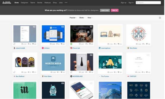 Dribbble的卡片很容易分辨、排列、和点击,让人了解某个项目的详细信息。它的设计在浅色背景上使用了白色的卡片,每张图片下方有个内容区域显示作品。浅色在桌面端表现尤其优秀,对于眼睛很友好。