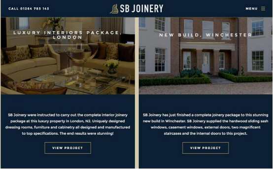 SB Joinery则选用了深色的配色——在深色背景上使用反白文字——并在图片上叠加了颜色,让视觉重心停留在文字和幽灵按钮上。弹出菜单同样使用了深色主题。得益于粗字体和高对比度的色彩,深色风格的卡片易读性强,极其实用。
