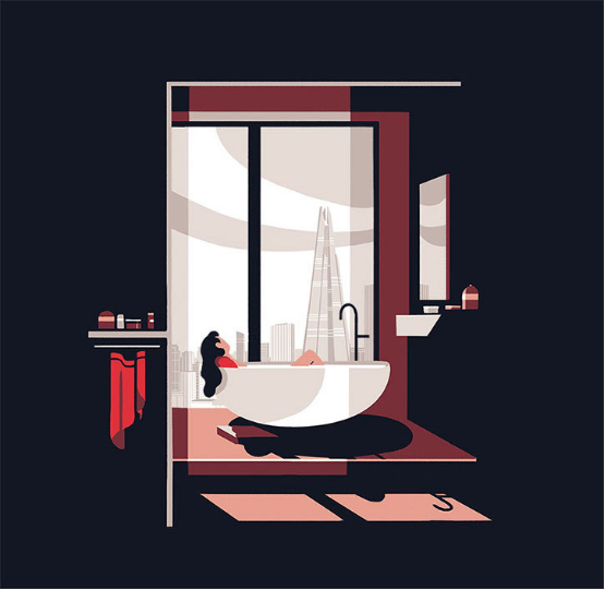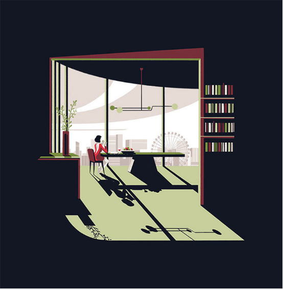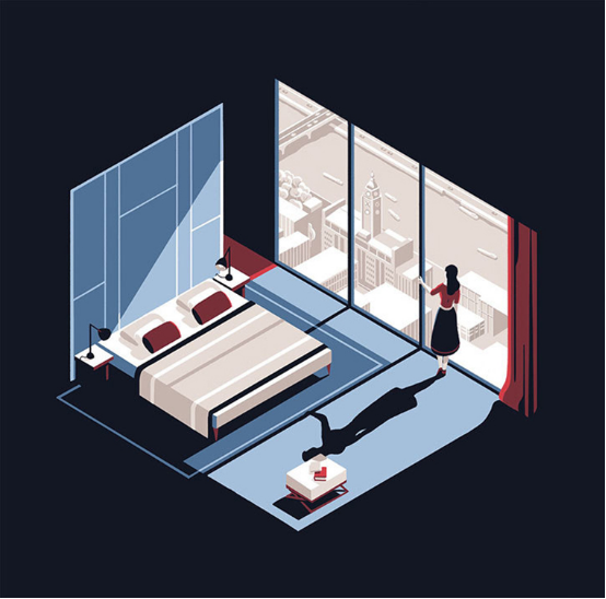 一个房间的写照,偌大的透视窗,文静简约的房间装饰,外面是都市的场景,画面体现主人公将会在一个时尚又温情的房间里看外面的都市生活场景,一来空间想象大大提升,二来,把楼板的位置装扮出色的表现出来,一举两得,这就是扁平风设计的独特味道。