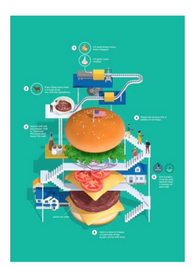 下面是一个汉堡包的营养健康图,要是你要做一张汉堡包的健康饮食图,你会不会只想到了以健康的生活环境,以人为背景,然后把汉堡包p的美美的,让人看着就想吃?但是你想一下,电视上看到的广告何尝不是这样?只是为同样的感觉换了一个样子,也许也是一个精美的设计,但是,会不会有点类似,那么下面这张图将会劲爆你眼球,这是一个国际获奖作品,设计师把制作汉堡的流程图加在汉堡包上,旁边还加设了材料的示意图,是不是很让人匪夷所思,但是这个就能利用一张图把健康材料暴露的一览无遗,让客户放心饮食啦。