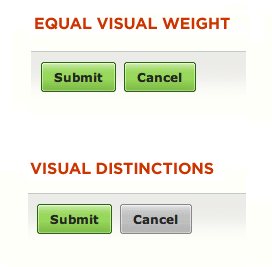 视觉重量。当两个选项之间有明显区别的时候,你应当让两个按钮拥有不同的视觉重量,让其中一个成为视觉的重心。处于视觉重心上的按钮会获得更多的注意力。