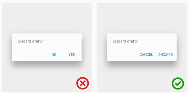 接下来的这个对比案例中,个对话框中,“No”仅仅是回答问题,但是并没有指向性,并未指出这么选择的后果。而第二个对话框则好了许多,“Cancel”和“Discard”两个选项,后者和前文所提出的问题相对应,指向性明确,而Cancel 的含义也就更加清晰了。