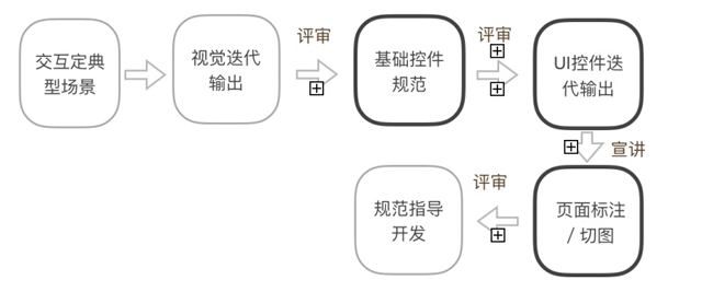 由交互提供具体场景的典型页面,视觉稿进行输出,多次迭代评审敲定后,再由开发提出缺失场景的视觉设计,视觉进行场景补充;