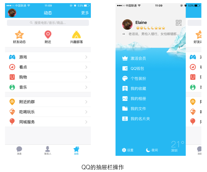 QQ的抽屉栏更多的是要适应大屏时代的手势操作,即抽屉栏向右滑出,但也保留了人们点击右上角头像的习惯性做法