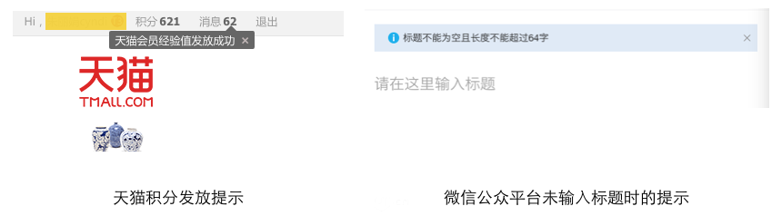 有的提示一闪而过,比如保存成功、修改成功、支付成功等等;有的提示却需要用户手动关闭,例如下图的两个例子,天猫为了让用户感知到经验值发放成功,在消息位置给出了提示,即使你打开新的天猫页面,这个提示依旧存在,直到你注意到并关闭它;还有微信公众平台的编辑器,如果未输入标题便进行发布,提示也会一直存在标题上方。因此在做设计时,提示的位置、出现的时间、是需要用户重视还是忽略,都需要我们认真考虑。