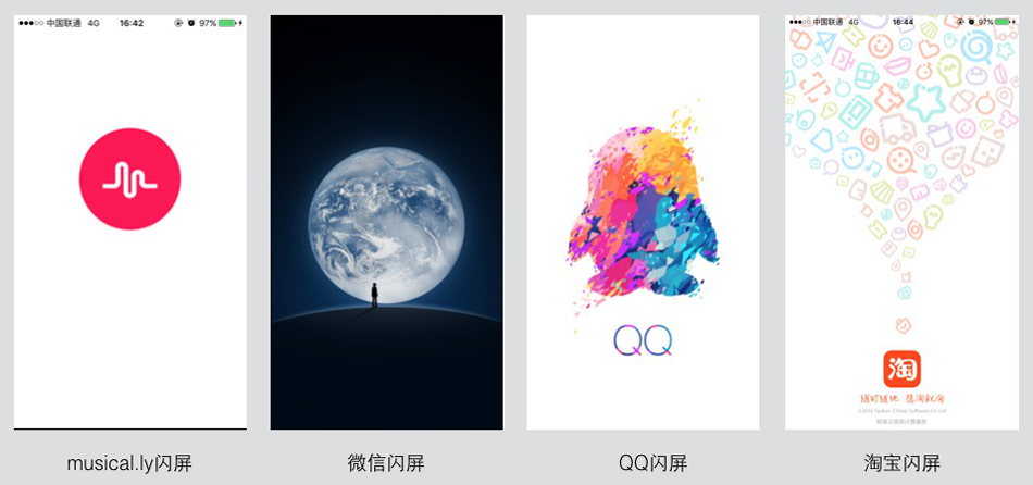 如下图的闪屏页面,都做得非常简洁,一个logo或者一张极具产品思想的图片即可让人记住