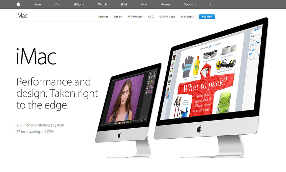 这样一来,使用浅蓝色实底的“立刻购买”按钮和背景构成了鲜明的对比,相当的显眼。当你打开页面的时候,会一眼注意到购买按钮,这就是通过大量的留白和合理的对比营造出来的视觉引导。