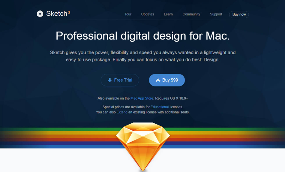 著名Mac平台设计软件Sketch的官方网站的设计就是个很好的例子,深色和浅色被容纳到一个统一的页面设计中来。在页头中,你会注意到两个按钮:深色的“免费试用”和浅色的“立刻购买”。有意思的是,两个按钮都是同样的大小,并且处于同一个水平面上,并且是同一色系。但是,“免费购买”的按钮被设计成为幽灵按钮,整体和深色背景几乎融为一体。