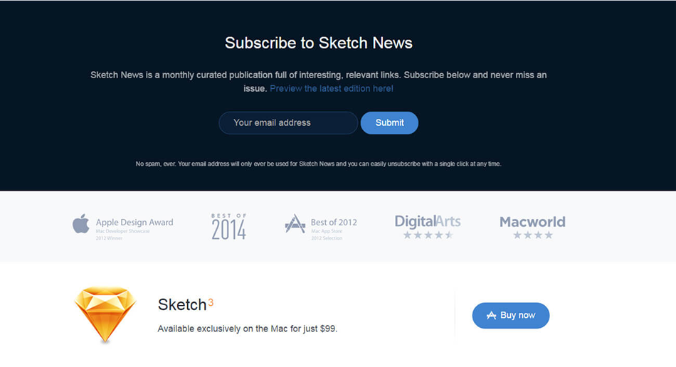 Sketch 希望你在输入邮件地址之后尽快提交,所以提交按钮布置得同输入框非常近。根据Fitt定律,两个元素之间的距离越近,用户的浏览和切换速度越快。值得注意的是,提交按钮的色彩和之前的不对称设计保持着一致,让你非常容易注意到,勾引你去点击,而这也正是Sketch想要的。