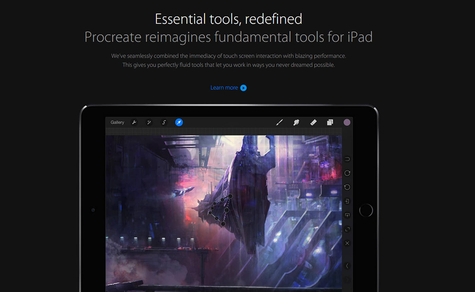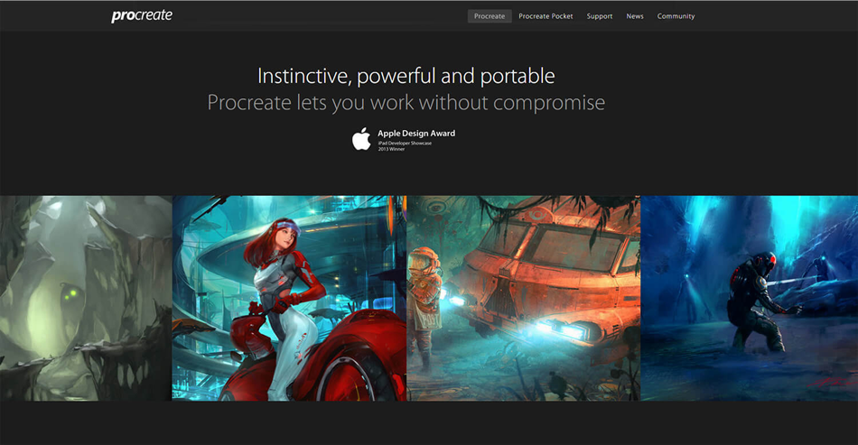 iPad 平台上的绘图工具 Procreate 的官方网站就是一个不太一样的案例。简单扫视一下这个页面,页面整体采用的暗色调配色,整体布局并不复杂,使用的页面元素尺寸相当大。
