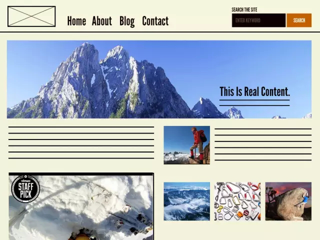 模板是非常具体而有形的,它的存在给所有相关的抽象的分子和组织提供了一个很好的平台。它同样能让用户看到终设计所在的位置。根据我对这个原子化设计方法的经验,模板的生命是从HTML 线框图开始的,但同时随着时间的推进它终要变成一个可交付的东西。匹兹堡的Bearded工作室也是这样。他们的设计始于灰度,构图很少,但逐渐变得清晰直到终的设计。