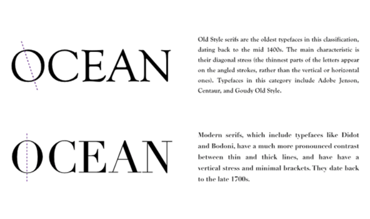 衬线体可以分成两类:类似手写的衬线体叫“旧体”,笔尖会留下固定倾斜角度的书写痕迹,O字母较细的部分连线是斜线。旧体并不意味过时,传统书籍正文通常用旧体排版,适合长文阅读。
