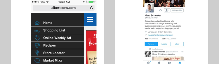 Albertson 的移动端页面将首页的图标隐藏在汉堡图标下的侧边栏当中,即使是转型使用无限滚动界面的Twitter,在设计客户端的时候也习惯性地将首页按钮固化在底部的菜单栏当中。