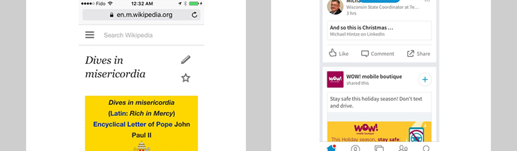 维基百科的移动端页面自然而然地将搜索框置于页面顶部,这是网站属性所决定的。但是LinkedIn 则将搜索功能置于底部菜单栏当中,这也是某种意义上的固化于界面,这也符合逻辑——毕竟它的社交属性高于信息搜索。