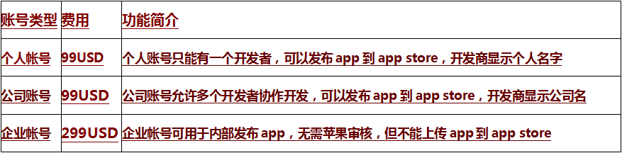 苹果开发者账号分为下表三种: