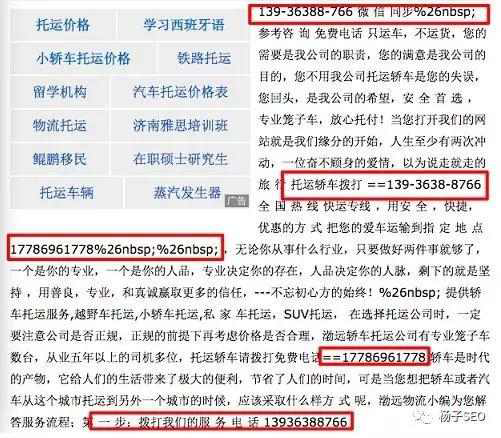2、商家为了在页面中频繁保留联系方式而做出的各种低质受益行为,如受益方式变形、穿插受益等。(例如在页面中频繁并以不同样式地出现电话号码、微信、QQ等联系方式)如下图所示: