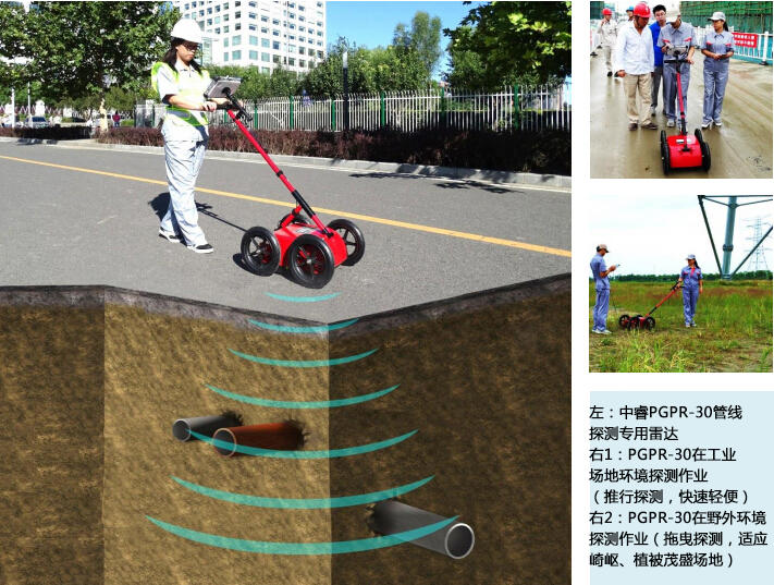 PGPR-30管線探測專用雷達(dá)是為精確探測和定位各類金屬、非金屬管線而設(shè)計的新型專用設(shè)備,由一體化主機(jī)、高性能屏蔽式天線、三防顯控終端和四輪(可切換兩輪)手推車等部件組成,便于攜帶作業(yè)、操作簡單、探測結(jié)果易于識別判讀,是目前性能先進(jìn)、使用方便的國產(chǎn)管線探測雷達(dá)。可廣泛應(yīng)用于管線普查和詳查、工程管線定位、環(huán)保監(jiān)督等各個領(lǐng)域。