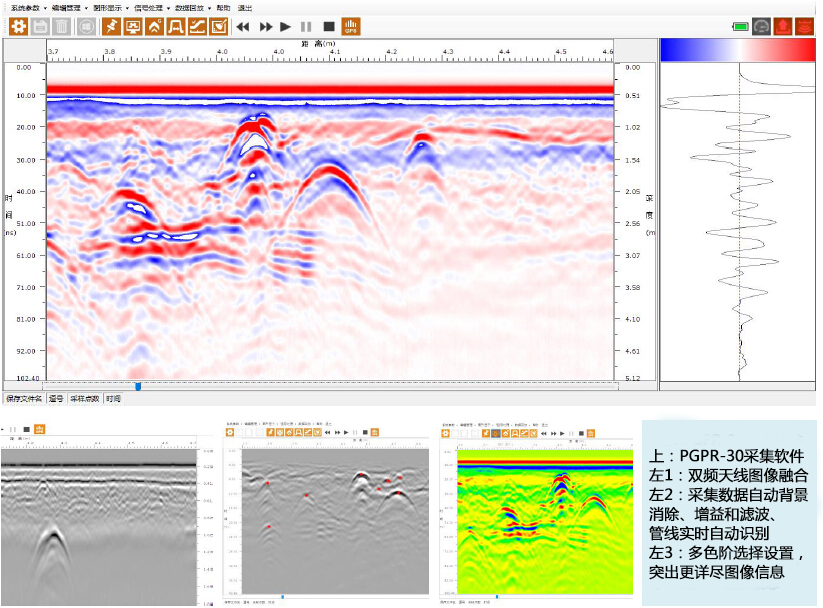 實(shí)時(shí)處理:背景去除,濾波,增益調(diào)節(jié);自動(dòng)管線識(shí)別;雙頻數(shù)據(jù)融合